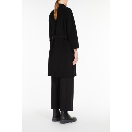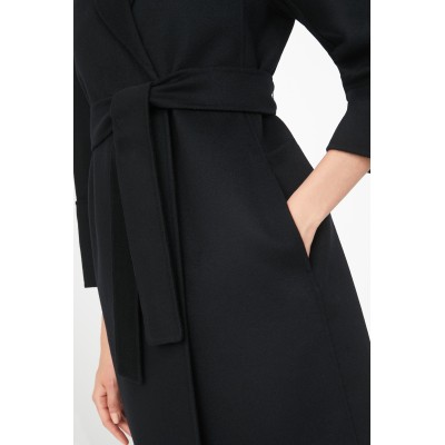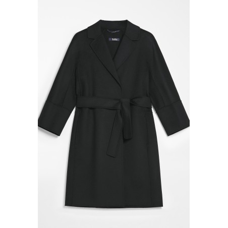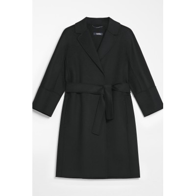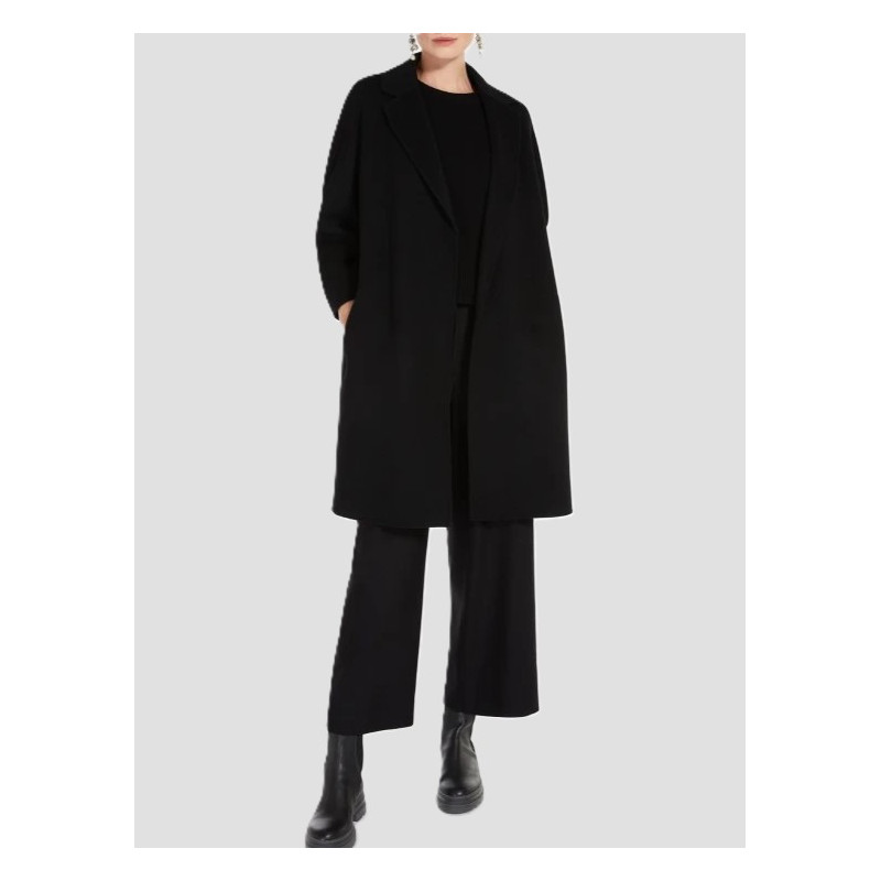 Short coat made of fine hand-stitched double pure wool fabric. Characterized by a wide line slightly closed at the bottom. Unlined model completed with small lapel collar, inset pockets on the sides, kimono sleeves on the front and raglan on the back. The matching belt at the waist allows you to highlight the silhouette. Made in Italy