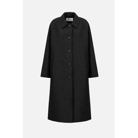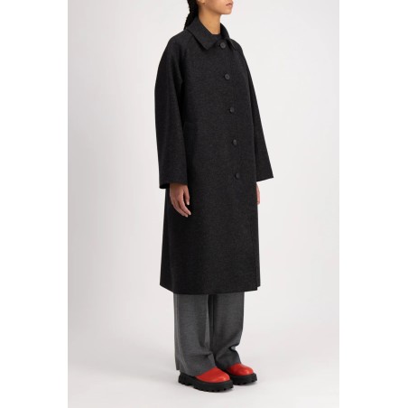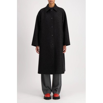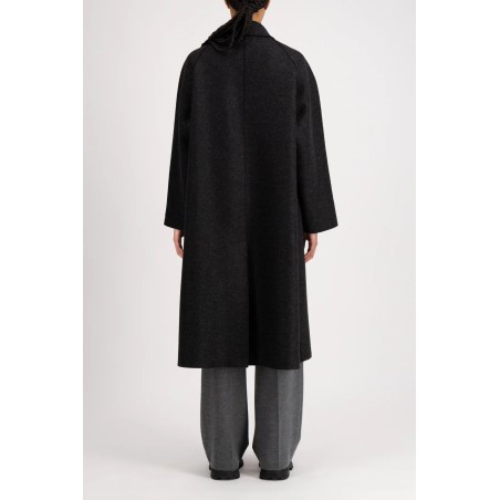 Long oversized shape with long raglan sleeve featuring a button-up collar. Raw-edge finish. Made in Italy with Italian fabric