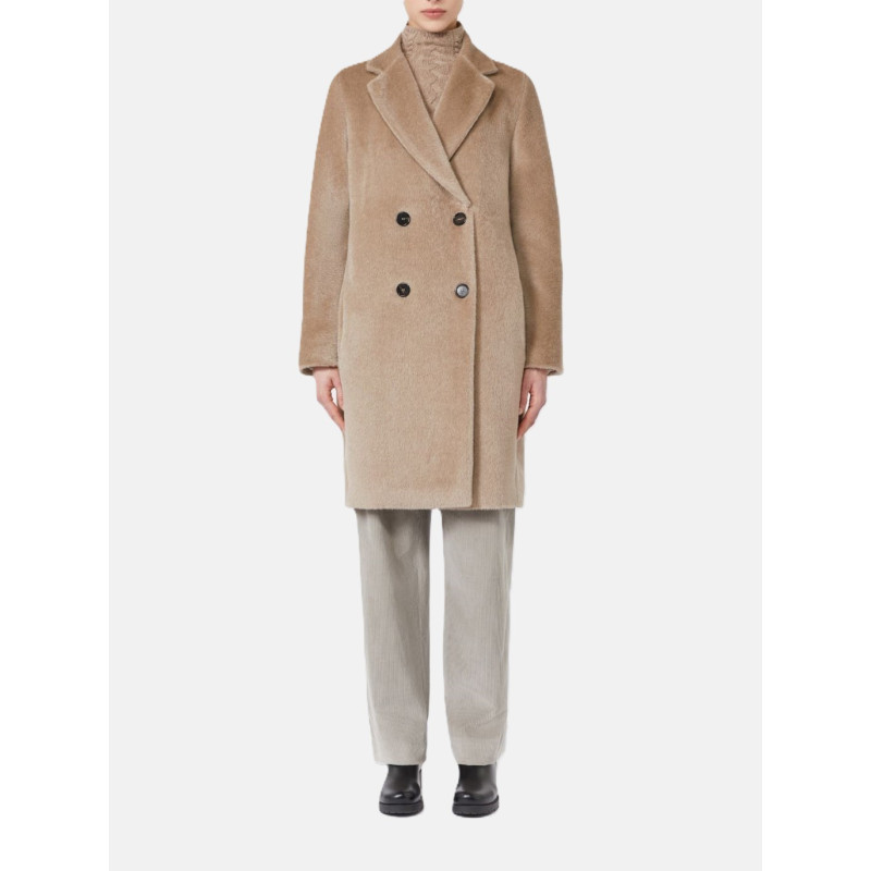 Double-breasted midi coat with a slightly cinched egg-shaped silhouette. Brushed wool and alpaca fabric with internal lining.