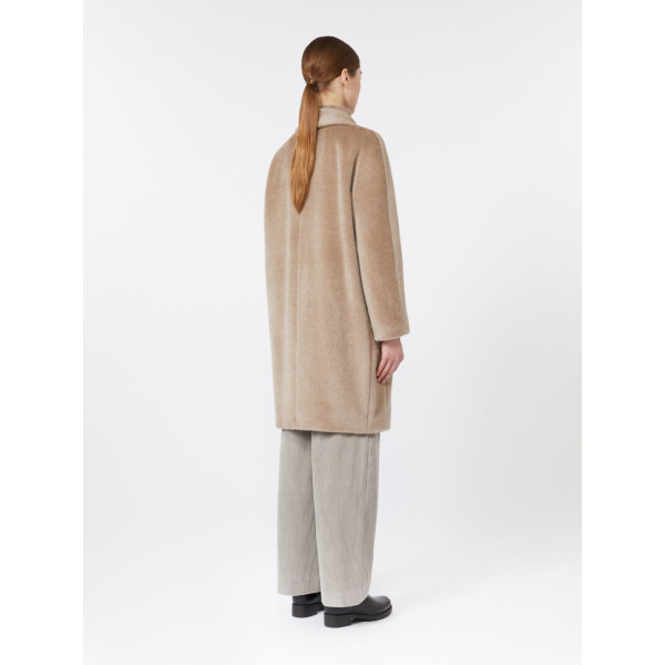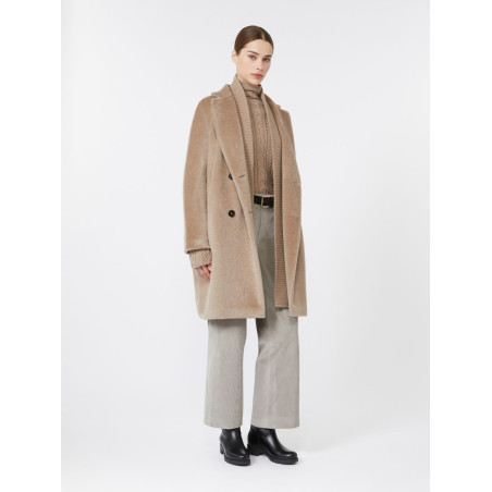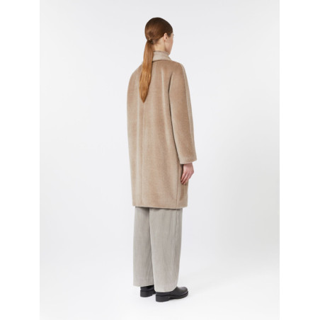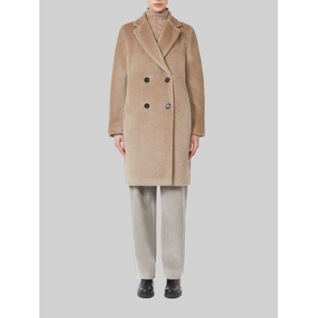 Double-breasted midi coat with a slightly cinched egg-shaped silhouette. Brushed wool and alpaca fabric with internal lining.