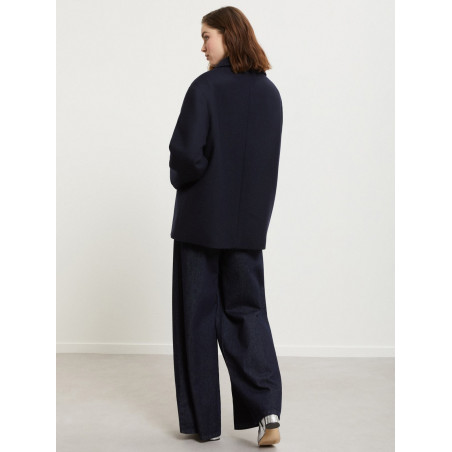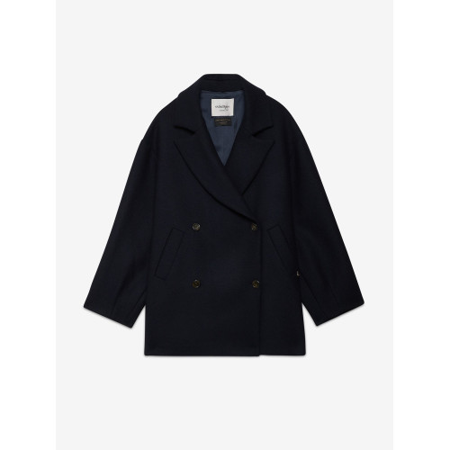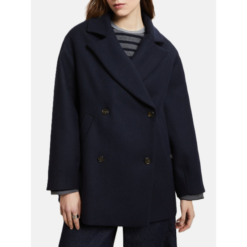 Egg-shaped double-breasted wool blend peacoat with lapels. Lining.