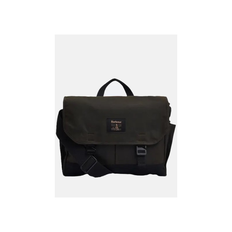 Barbour waxed canvas shoulder bag. Adjustable shoulder strap, top handle, and internal laptop compartment. Barbour label on the center flap.
