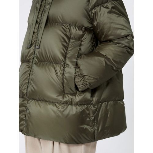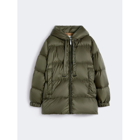 Slightly oversized short down jacket with an all-over quilted horizontal stripe pattern. Drawstring hood, long sleeves with elastic cuffs, and a front zip closure. Goose down padding.