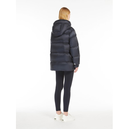 Slightly oversized short down jacket with an all-over quilted horizontal stripe pattern. Drawstring hood, long sleeves with elastic cuffs, and a front zip closure. Goose down padding.