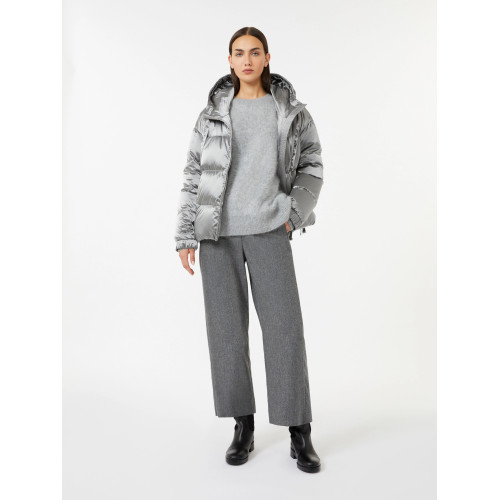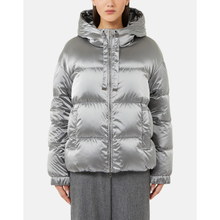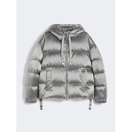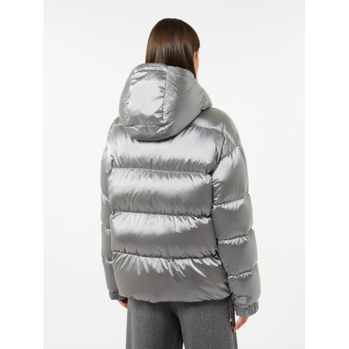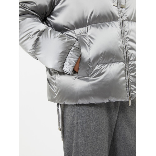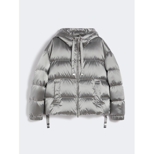 Short down jacket in iridescent, water-repellent nylon satin. Featuring a drawstring hood, long dropped-shoulder sleeves with elastic cuffs, and a two-way front zip. Filled with goose down.