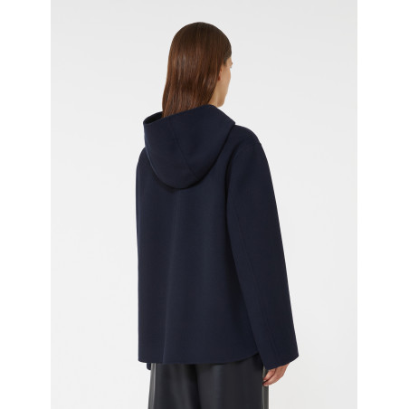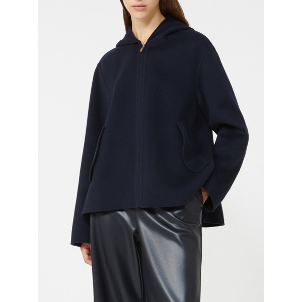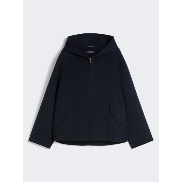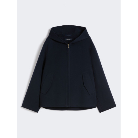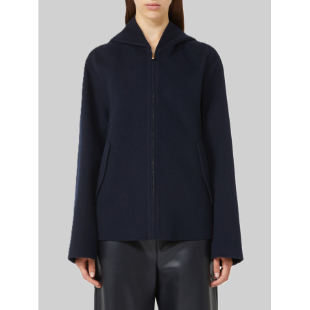 Hand-sewn double wool drap sweatshirt jacket. Dropped shoulders, gold-tone metal front zip. Diagonal welt pockets at the sides. Silk lining on the sleeves. Made in Italy
