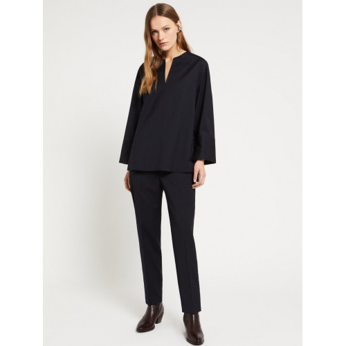 Pinstriped cool wool blouse with notched neckline, side slits and wide sleeves.