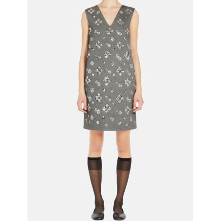 Abito corto smanicato, realizzato in morbido jersey di mista viscosa lavorato a punto Milano. Modello foderato dalla linea dritta con scollo a V, impreziosito applicazioni gioiello ricamate sul davanti