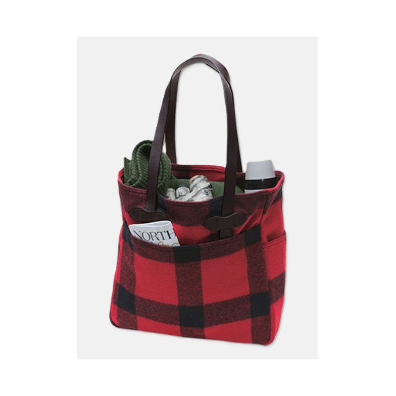 Borsa a spalla Filson con doppio manico in pelle con ampie tasche fronte e retro, due tasche laterali. Portachiavi cucito internamente con moschetto. Stampa checked rosso/nera. Made in the USA
