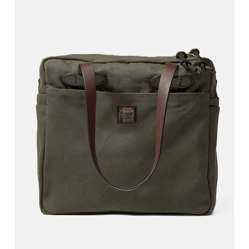 FILSON - La TOTE BAG con zip è realizzata in Rugged Twill idrorepellente e resistente all'abrasione per una maggiore durata e resistenza agli agenti atmosferici. Interno spazioso per contenere oggetti voluminosi, quattro tasche esterne adatte a piccoli oggetti. Manici in pelle di vitello e cerniera in ottone antiruggini. Made in Italy