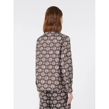 Camicia in twill di seta stampata. Collo a rever piccolo a doppio uso e maniche lunghe a giro. Chiusura frontale con bottoni in madreperla. Taschino applicato sul petto. Fondo squadrato con spacchetti laterali
