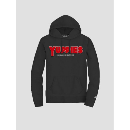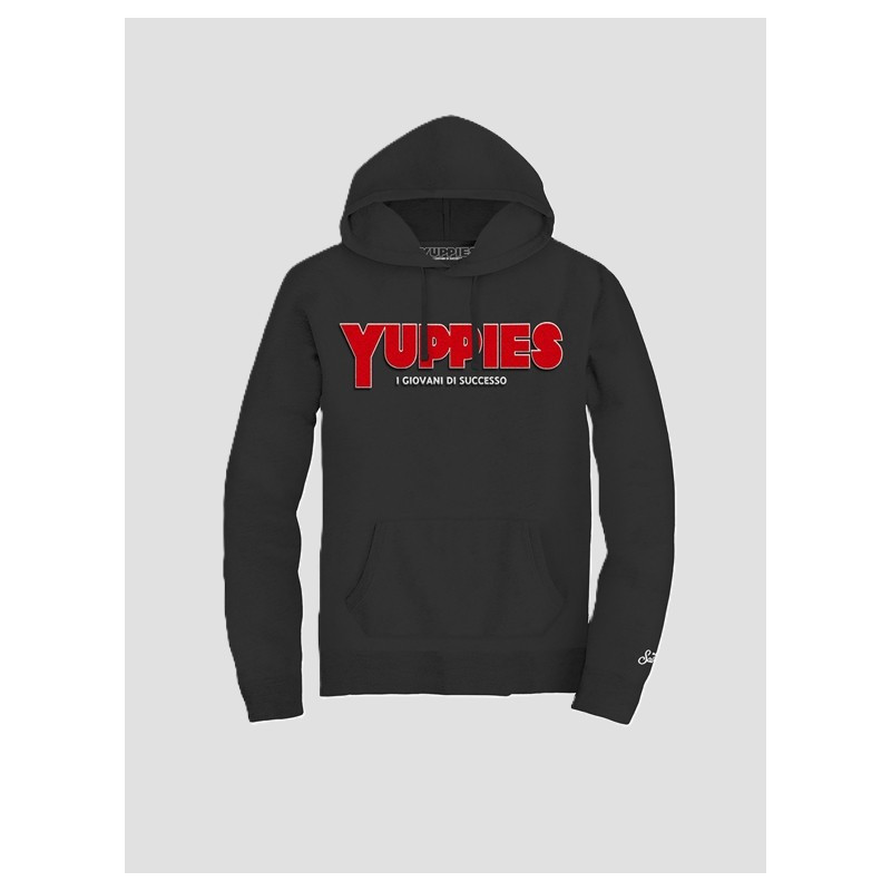 Felpa con cappuccio e tasca a marsupio. Realizzata in cotone con interno spazzolato. Costina abbinata. Stampa centrale Flock a contrasto licenza Yuppies