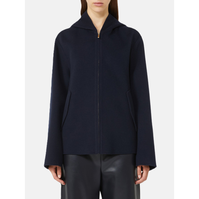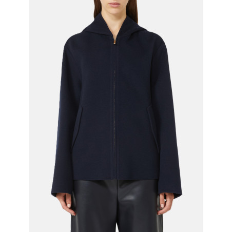 Giacca a felpa in drap di lana double cucita a mano. Spalla scesa, zip frontale in metallo dorato. Tasche a filetto diagonale sui fianchi. Fodera sulle maniche in seta. Made in Italy