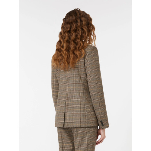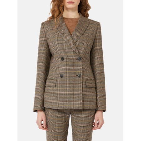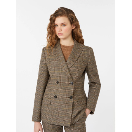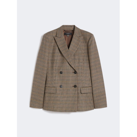 Blazer in batavia di lana doppiopetto,. Linea avvolgente con spacco centrale.  Revers a lancia e tasche a filetto con patta applicata. Interno foderato.