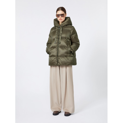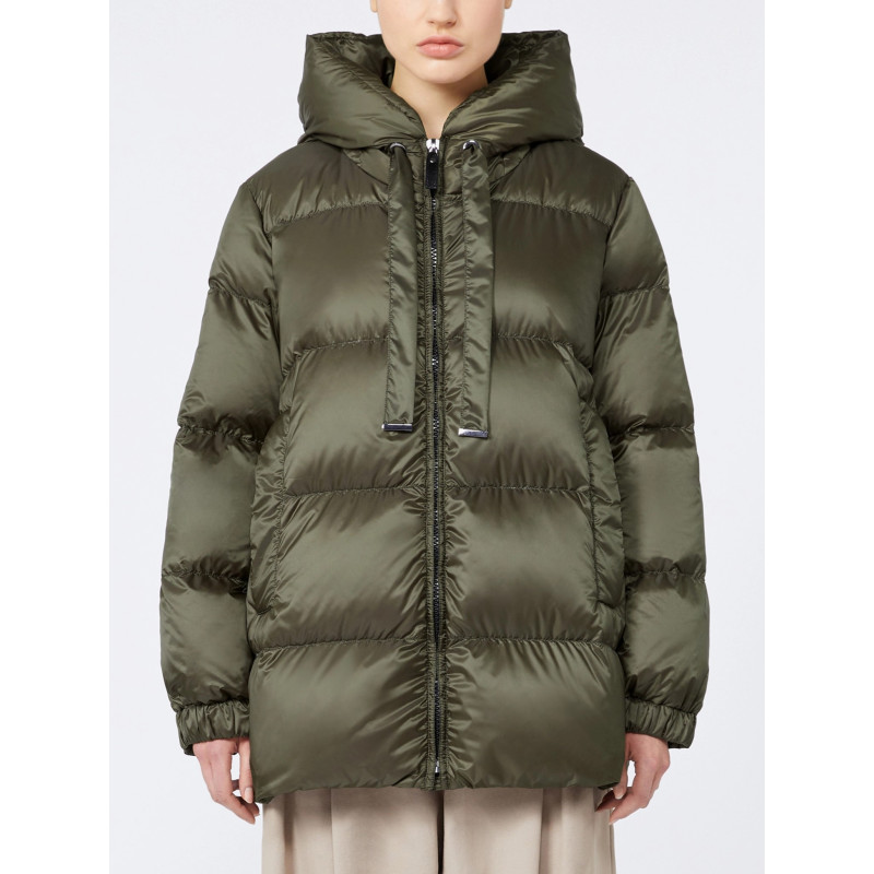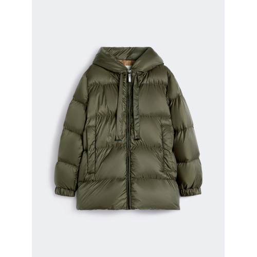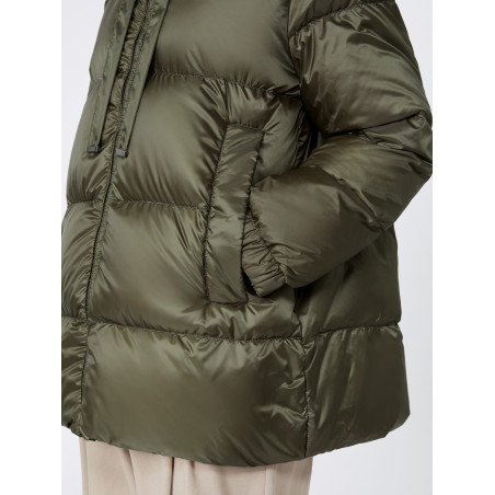 Piumino corto leggermente over, con motivo trapuntato all over a righe orizzontali. Cappuccio con coulisse, manica lunga con polsino elastico, chiusura frontale con zip. Imbottitura in piuma d'oca.