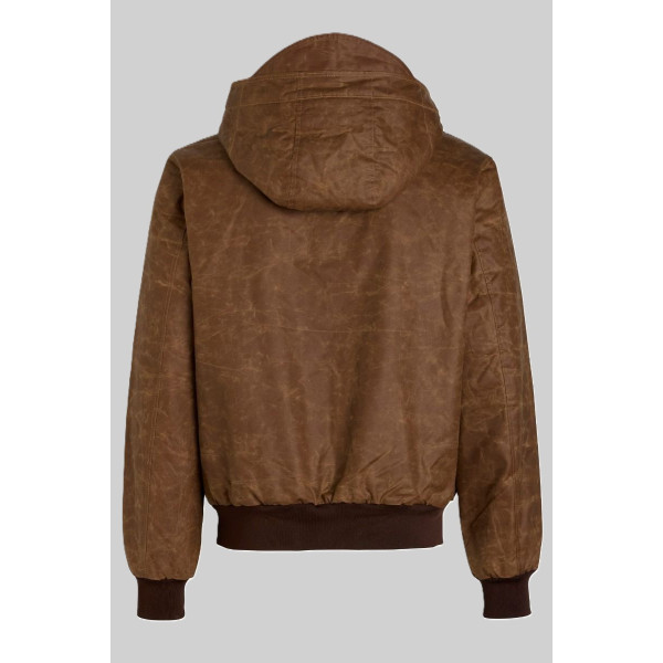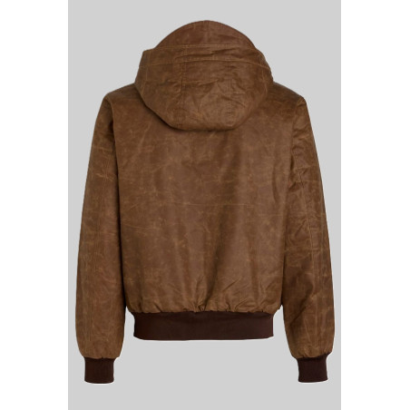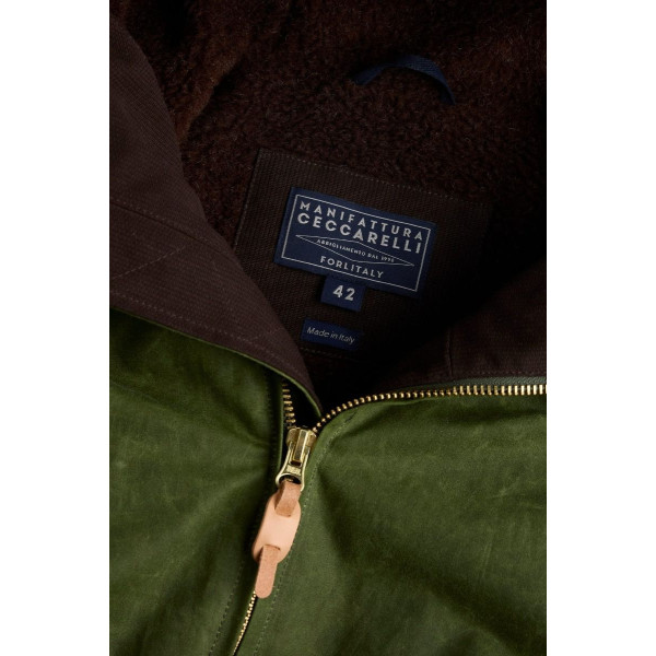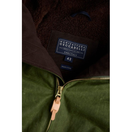 MANIFATTURE CECCARELLI - Il Bomber With Hood è realizzata in tessuto paraffinato idrorepellente e antivento, imbottitura corpo in orsetto 90% lana 10% poliestere, imbottitura maniche in ovatta di lana da pecore allevate in Italia, cappuccio foderato con orsetto di lana. Chiusura frontale con zip a doppio cursore. Due tasche a filetto laterali. Tasca interna con zip di sicurezza. Cucita con filo idrorepellente. Ogni bottone a pressione ha dischetti di rinforzo in cuoio. Tutti gli accessori in pelle sono in cuoio naturale tinta vegetale. Prodotto in Italia
