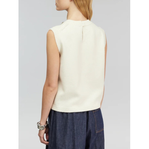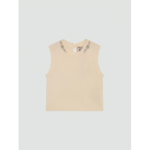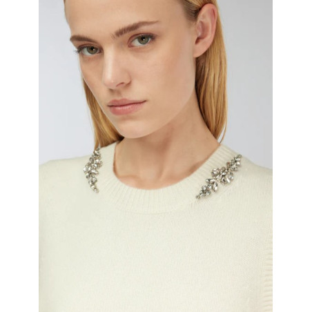 Gilet in cashwool con applicazioni gioiello sul collo. Lunghezza vita, apertura a goccia sul dietro con bottoncino. Veste regular