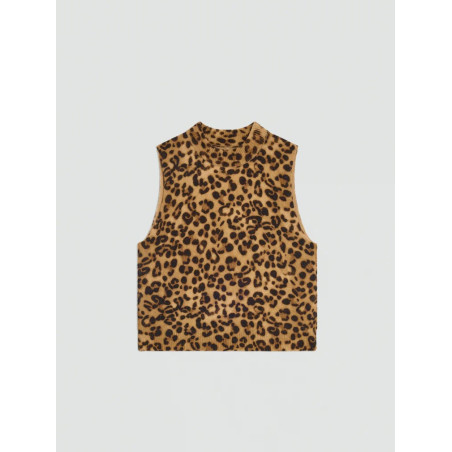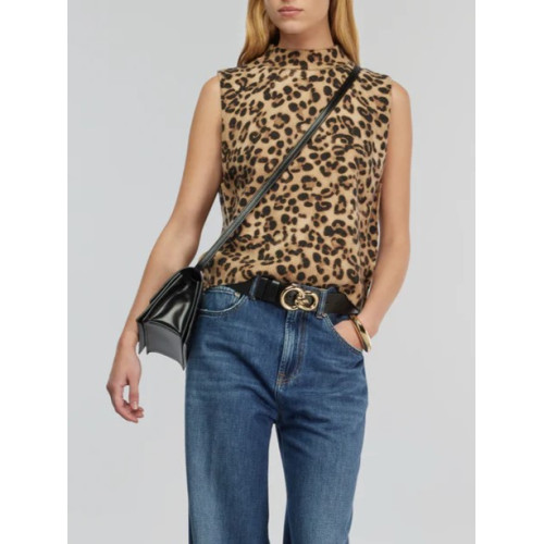 Maglia smanicata in cashwool stampa animalier. Modello a collo altro. Lunghezza bacino, vestibilità regular.