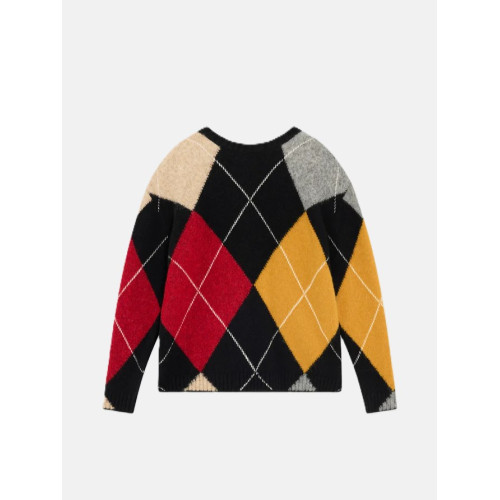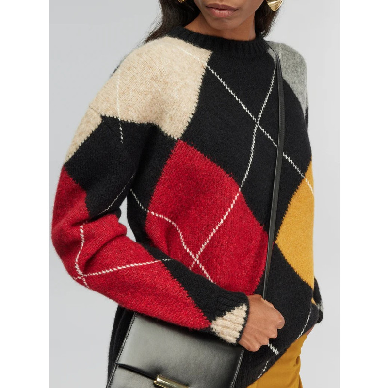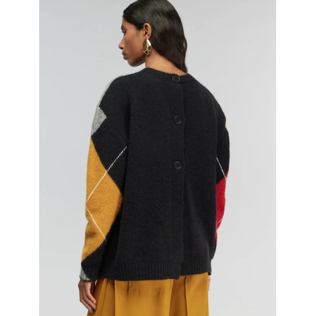 Maglia a rombi con bottoni in misto alpaca. Girando l'apertura a bottoni sul davanti il capo può essere indossato anche come cardigan. Manica lunga a raglan, lunghezza bacino. Veste over. Made in Italy