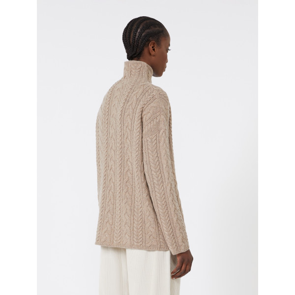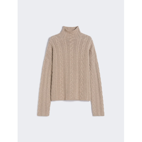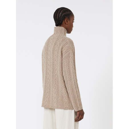 Maglia a dolcevita lavorata a trecce. Volume ampio e avvolgente, manica a spalla scesa. Bordo basso dritto.