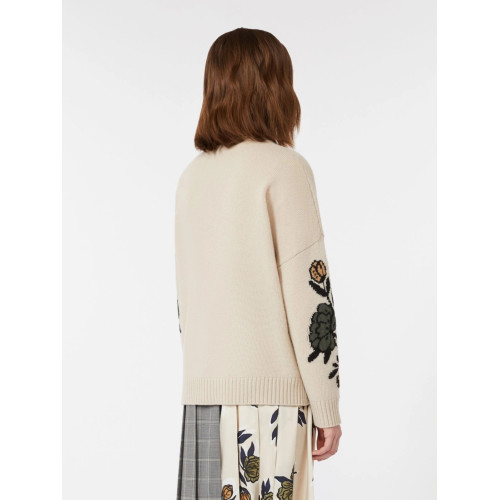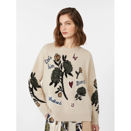Maglia girocollo in lana a lavorazione intarsio con disegni di collezione sul davanti e sulle maniche. Manica lunga a spalla scesa. Bordi a coste. Veste over