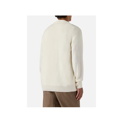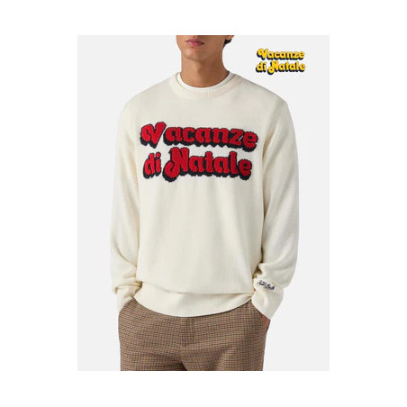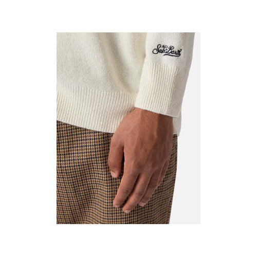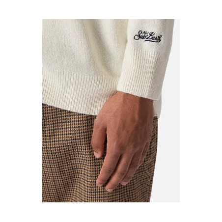 Maglione girocollo avorio da uomo. Collo, polsini e orlo a coste. Ricamo del logo St. Barth sul polsino. Jacquard logo Vacanze di Natale