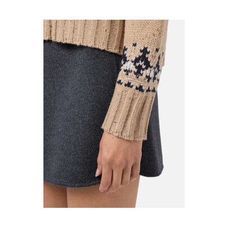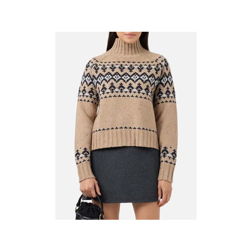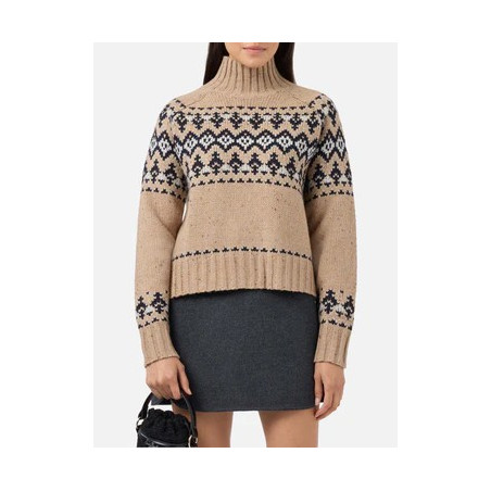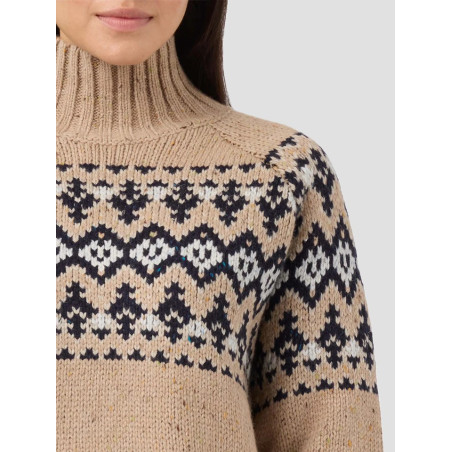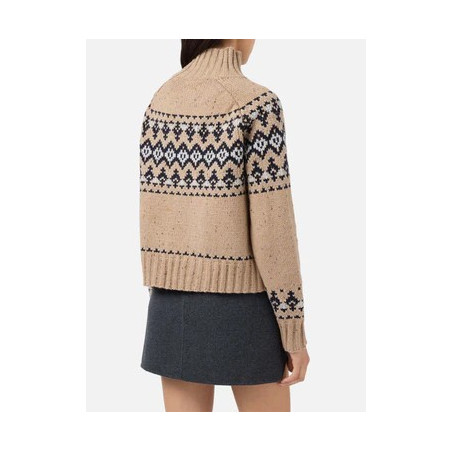 Maglia fantasia a lavorazione jacquard con disegno fair isle. Collo a lupetto. Base beige. Maniche lunghe raglan. Polsi, fondo e collo a coste singole. Vestibilità chunky. Filato donegal