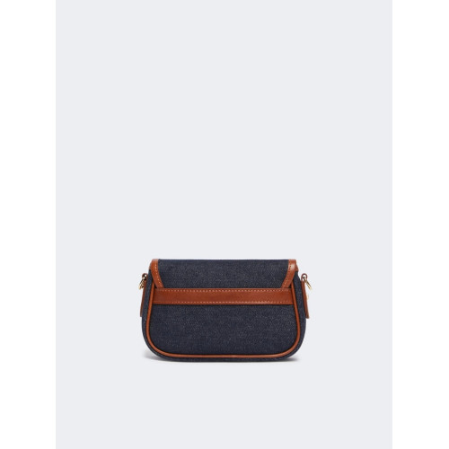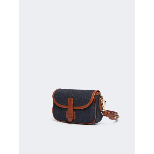 Piccola borsa in denim con dettagli in cuoi a tracolla. Tasca a toppa interna sul retro con label personalizzata. Due tracolle intercambiabili in cuoio e nastro con logo jacquard. Chiusura a patta con cinturino e passante frontale