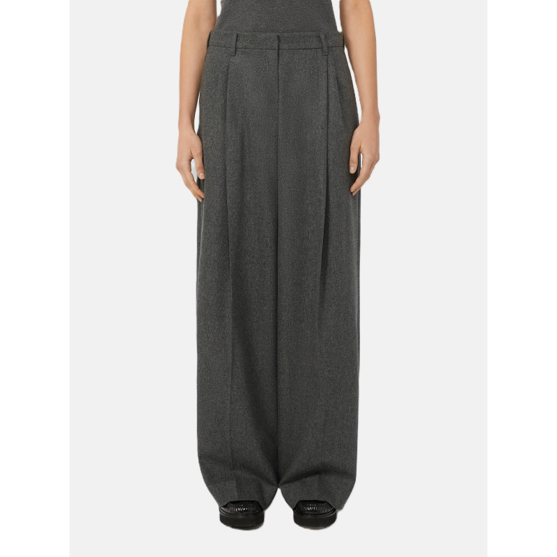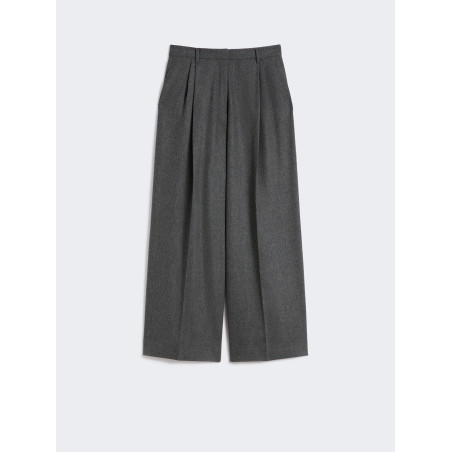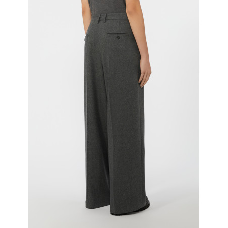 Pantalone ampio in flanella di lana stretch, silhouette a gamba larga con doppia pinces. Chiusura con listino alto in vita, zip coperta e gancetto. Tasche alla francese e tasche a filetto con bottone in corno sul dietro. Passanti per cintura.