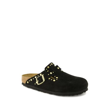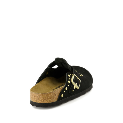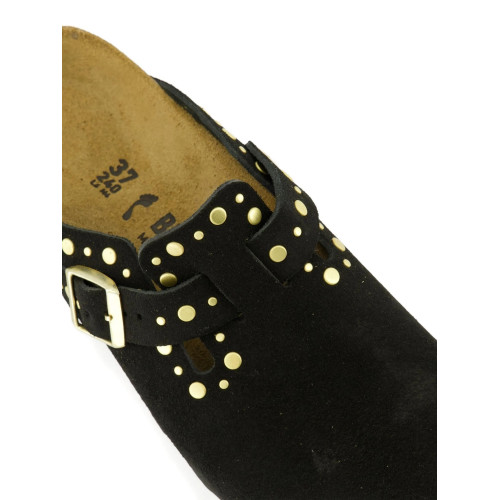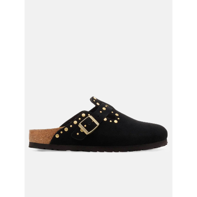 Il classico sabot Birkenstock Boston in morbida pelle scamosciata è stato customizzato dall'applicazione di rivetti in ottone. Il plantare Soft Footbed migliora il comfort di indosso grazie all’inserto aggiuntivo in schiuma. La tomaia in pelle particolarmente resistente all'usura abbraccia il piede come una seconda pelle. Made in Germany