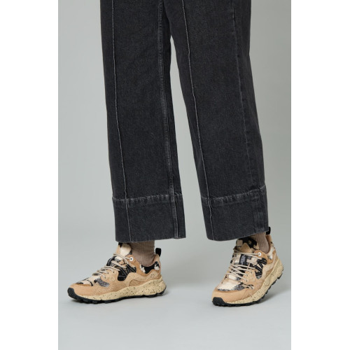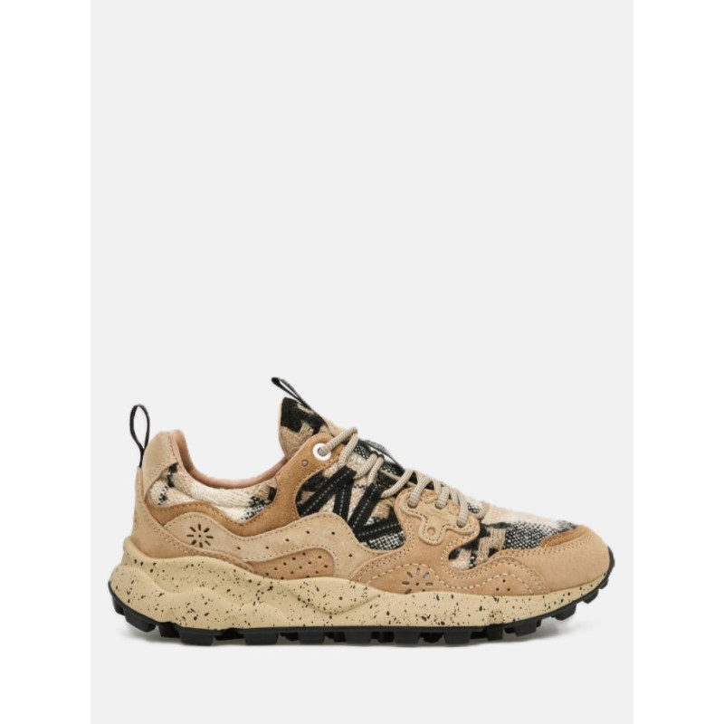 Sneaker in tessuto effetto patchwork e dettagli in suede. Chiusura con stringhe trekking a contrasto colore e occhielli personalizzati. Piccoli loop in nastro tecnico su linguetta e toppone. Fodera in tessuto e pelle, con soletta interna in sughero naturale antibatterico. Fondo in gomma ultra leggera con battistrada dentellato.
