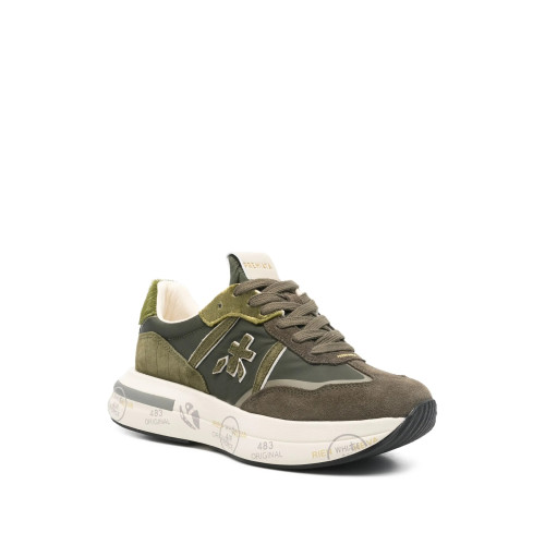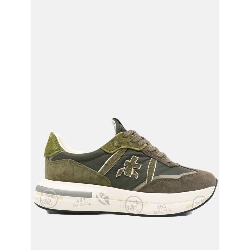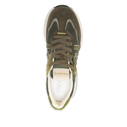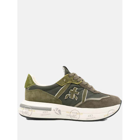 Sneakers Premiata in pelle scamosciata con tonalità verdi. Logo laterale a croce stilizzata, lacci in tinta e suola bianca con i distintivi timbri del brand. Design tecnico e contemporaneo, perfetto per uno stile urbano ricercato.